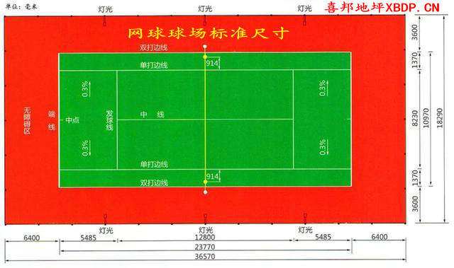 网球场地尺寸:一个标准网球场的长为36.6米,宽为18.3米,面积为669平米;主场部分长为23.77米,宽为10.97米,面积为260.75平米;四周的围网高为4米,需要照明灯杆8组,灯杆高度为6米;室内网球场高度最少为11.5米。