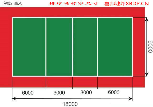 排球场地尺寸:一个标准排球场的长为24米,宽为18米,面积为432平米;主场部分长为21米,宽为12米,面积为252平米;室内网排球场高度最少为12.5米。